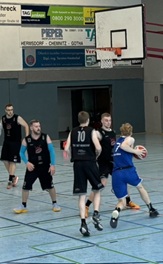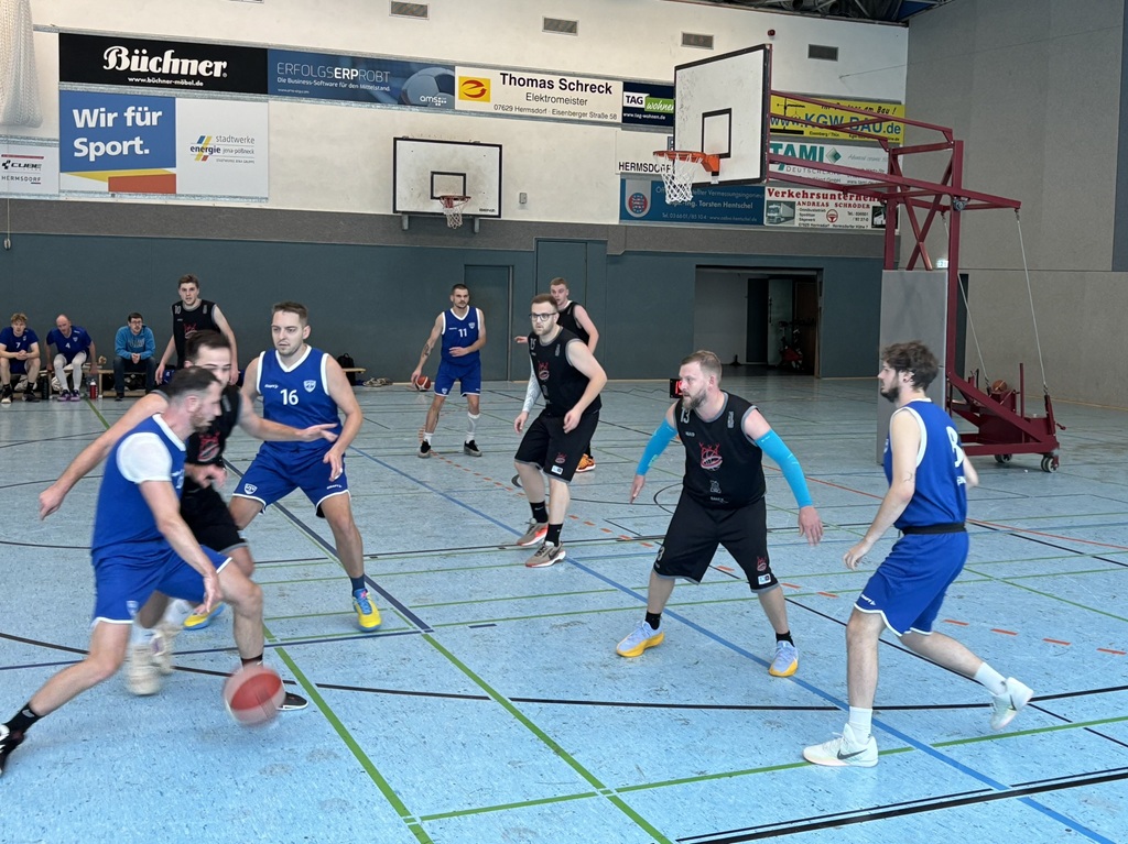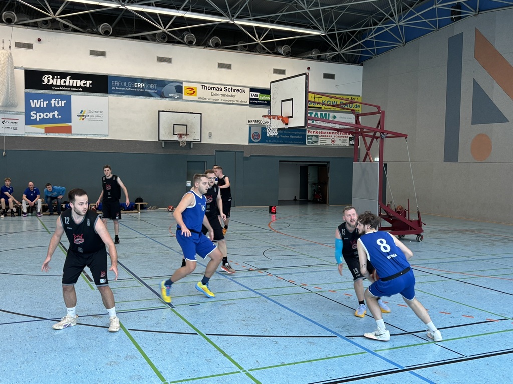 Dann zeigte sich aber, dass die Hermsdorfer zu wenig Spieler zur Verfügung hatten. Nacheinander bekamen die Spieler des TV Germania 5 Fouls zugeschrieben und mussten auf der Bank Platz nehmen. Letztendlich standen kurz vor Schluß nur noch zwei Hermsdorfer auf dem Parkett.